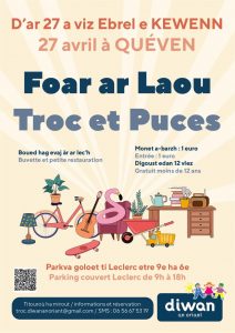 L’école Diwan de Lorient organise son grand vide-greniers de printemps le dimanche 27 avril sous le parpking couvert du centre E. Leclerc de Quéven.